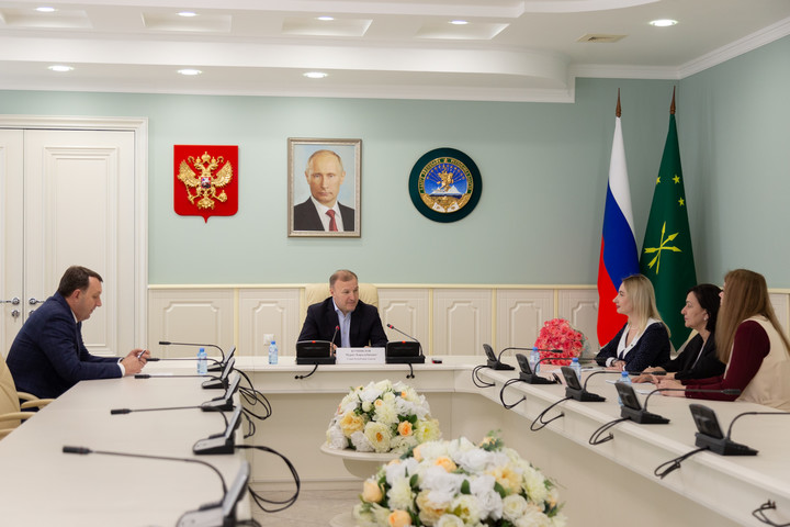 В Доме правительства республики глава Адыгеи Мурат Кумпилов принял члена Общественной палаты РФ, директора фонда «Звезда и Лира», руководителя АНО «Комитет семей воинов Отечества Самарской области», инициатора проекта «Жены Героев» Екатерину Колотовкину.