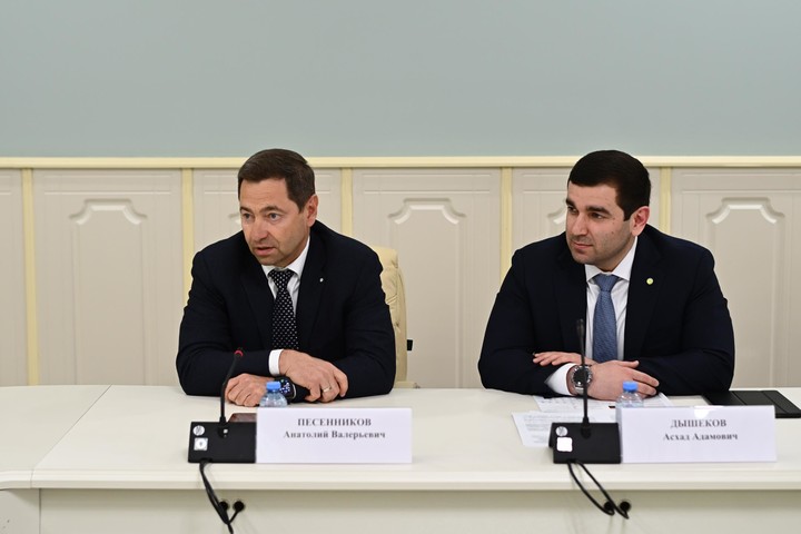 В ходе рабочей встречи Председатель Юго-Западного Сбербанка Анатолий Песенников и Глава Республики Мурат Кумпилов обсудили реализацию крупных совместных проектов, перспективы роста цифровой экономики и социальной сферы региона при поддержке Сбера. Во встрече также приняли участие заместитель Председателя Кабинета Министров – Министр финансов Виктор Орлов, и.о. Министра экономического развития и торговли Адыгеи Артур Чич и Управляющий Адыгейским отделением Сбербанка Асхад Дышеков.