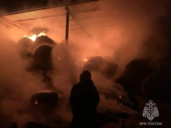 Сообщается, что в посёлке Новом произошло возгорание сена в металлическом ангаре. Площадь пожара составила 300 квадратных метров.
