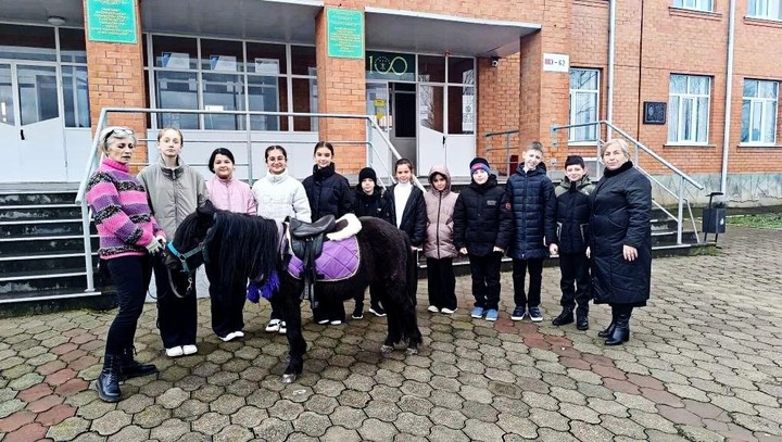 Пони Боря вместе с тренером Натальей Гоцак побывали в средней общеобразовательной школе № 9 и в детском саду "Буратино" аула Вочепший.