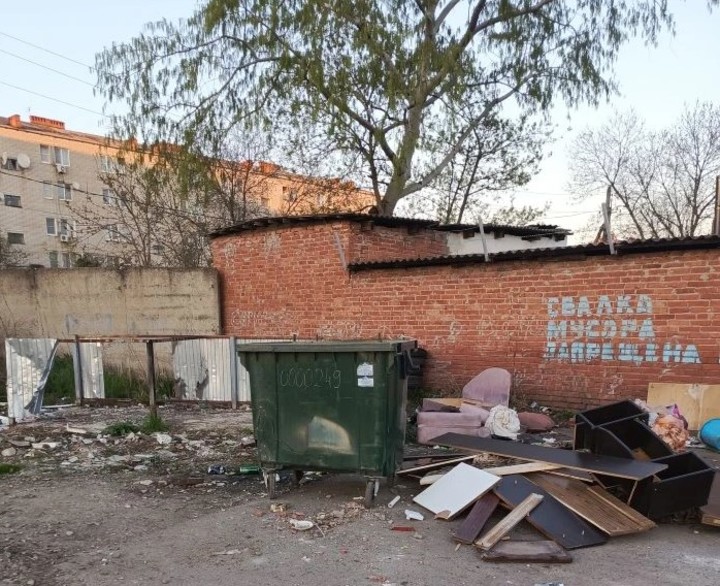 На фотографии видно, что рядом с баками лежат крупные отходы — части мебели, доски, плиты. Они сложены прямо на земле, из-за чего создается ощущение захламленности.