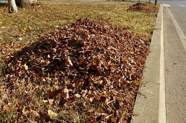 Собранная в кучи листва разлетается от легкого дуновения ветра