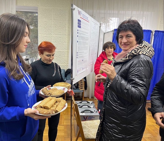 В Адыгее молодогвардейцы угостили блинами жителей Майкопа на избирательном участке