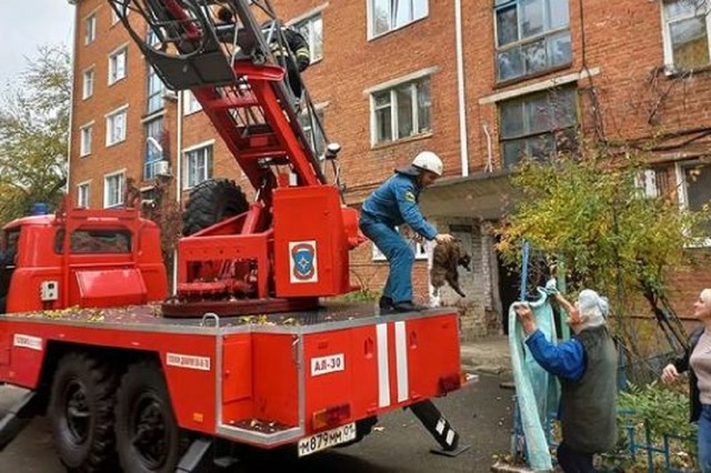 В Майкопе пожарные сняли с дерева застрявшую в ветках кошку